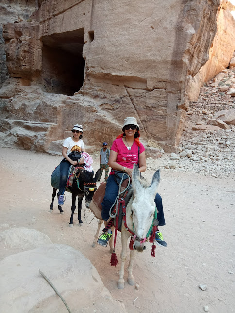 Enter the Siq, which is 1.5 km long narrow canyon. We were lucky – on the first day of our visit to Petra there were very few tourists. However burning hot it was outside, in the canyon it felt cool. It’s quiet, peaceful. The long walk didn’t tire us at all. In fact our guide entertained us with theories and stories. He even played a prank on us, made us walk backward with eyes shut only to behold the first glimpse of the grand treasury. Everything inside me was screaming with joy and excitement now.