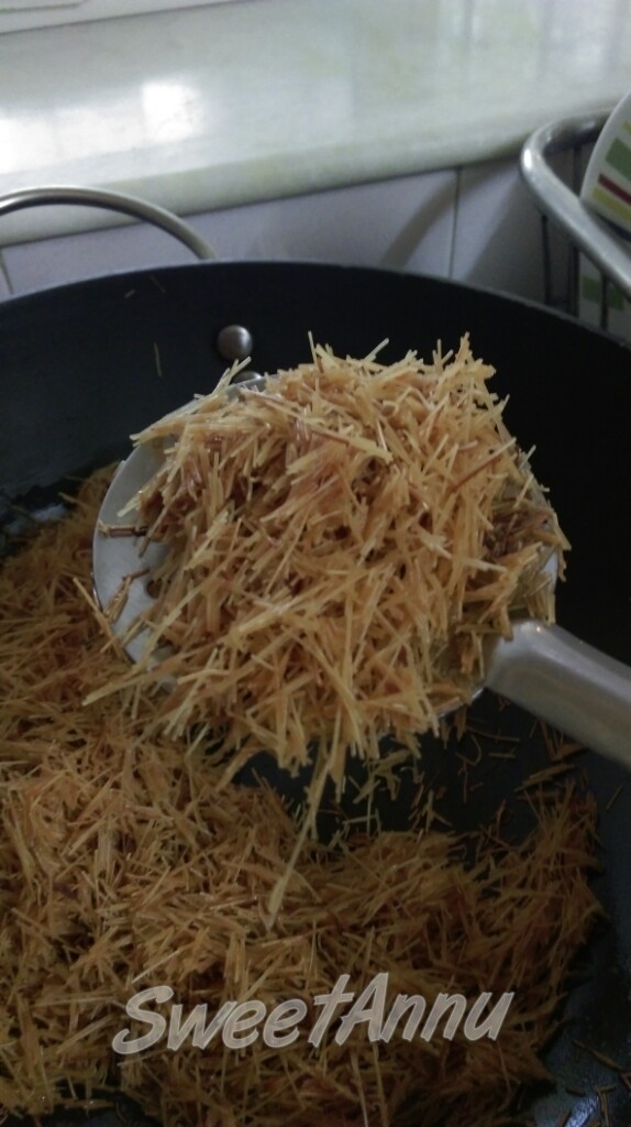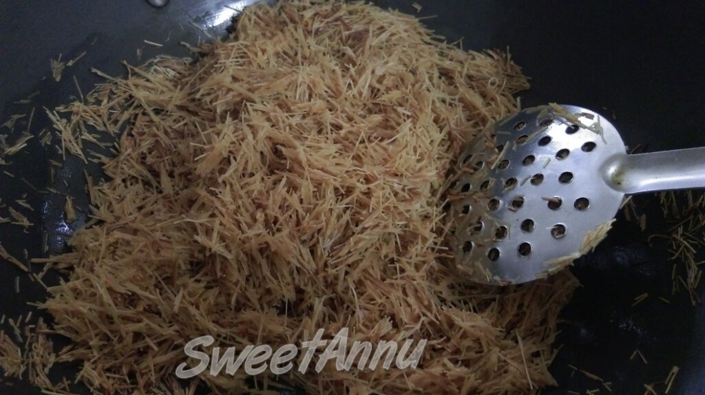 - Fry vermicelli in homemade ghee till dark brown in colour