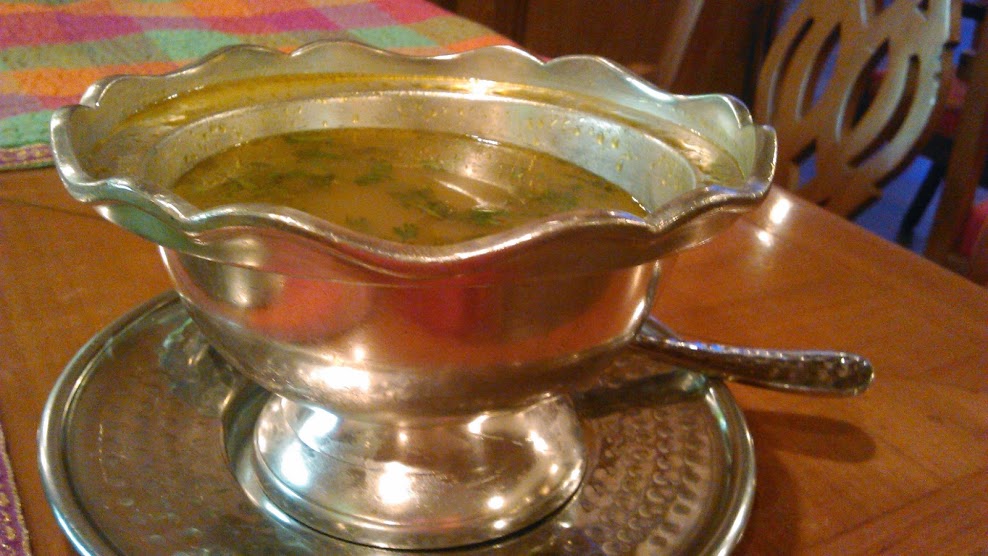 At first, we were served up hot chicken Broth in a majestic bowl fit for a King’s dinner table. It was peppery and worked like magic for my runny nose. South Indian Cuisine has a lot of pepper being used in their dishes as it is locally grown in South India.