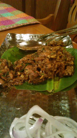 For starters they served us the Spiced Pepper chicken, It was outstanding and very tender and served in a well-polished silverware dish lined with a Banana leaf. The dishes were promptly cleared and ” Behold ” It was thali time now.