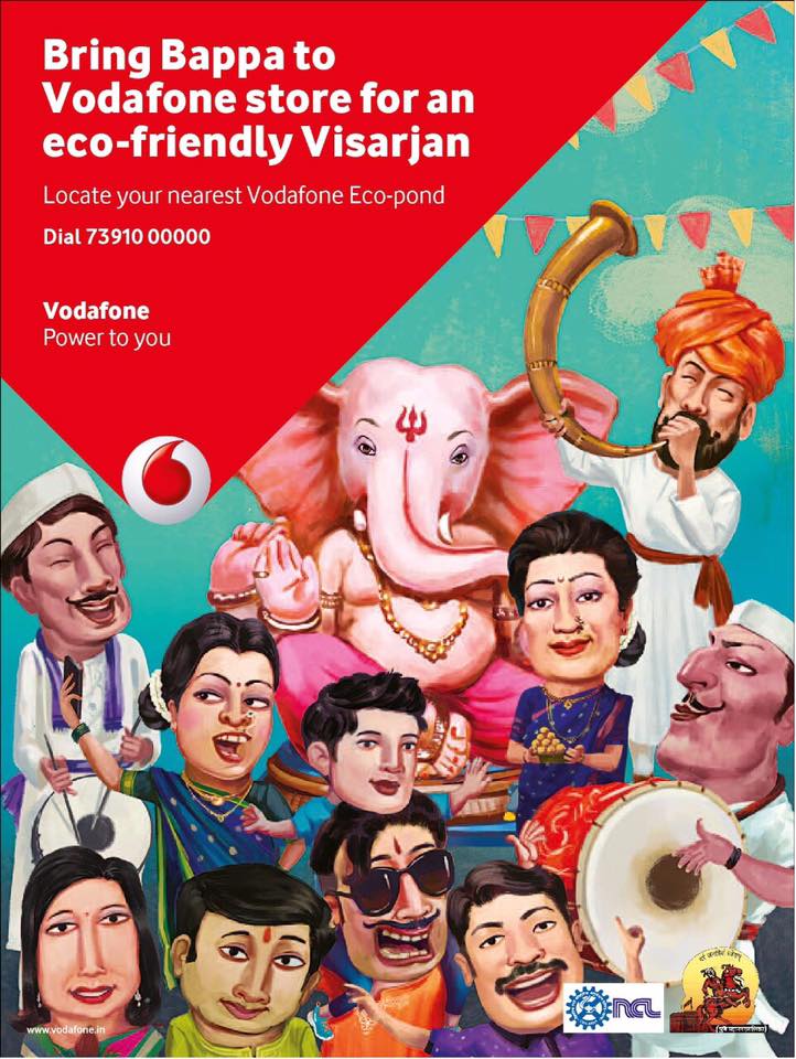 1. Vodafone has set up Vodafone Eco-Ponds. Here a temporary water tank setup equipped with a promoter and a lifeguard at 8 Vodafone stores across the city. This will help citizens across the city celebrate and immerse Ganesh idols in an environment-friendly manner.